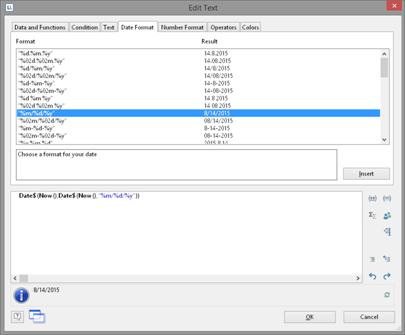 The "Now()" function, which returns the current date, is selected automatically as the date value. But if you want to format a different date value, simply replace "Now()" with the value that you want. You will find more information about the "Date$ ()" function under Overview of Functions.