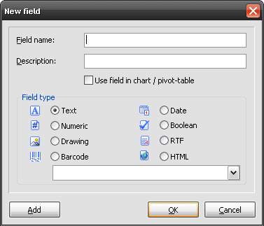 You can now generate the new field using the "Add" button, and create further fields without exiting the dialog; or click on "OK" to create the field and end the dialog. When you have created the field with the "Add" button, all input fields are deleted again.